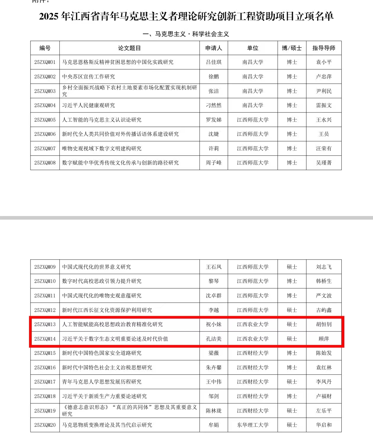 近日,2025年江西省青年马克思主义者理论研究创新工程资助项目(简称“青马工程”项目)立项名单公布。其中学院23级思想政治教育专业祝小妹申报的《人工智能赋能高校思想政治教育精准化研究》与23级马克思主义基本原理专业孔洁美申报的《习近平关于数字生态文明重要论述及时代价值》获批立项,展示了学院人才培养的风采。
