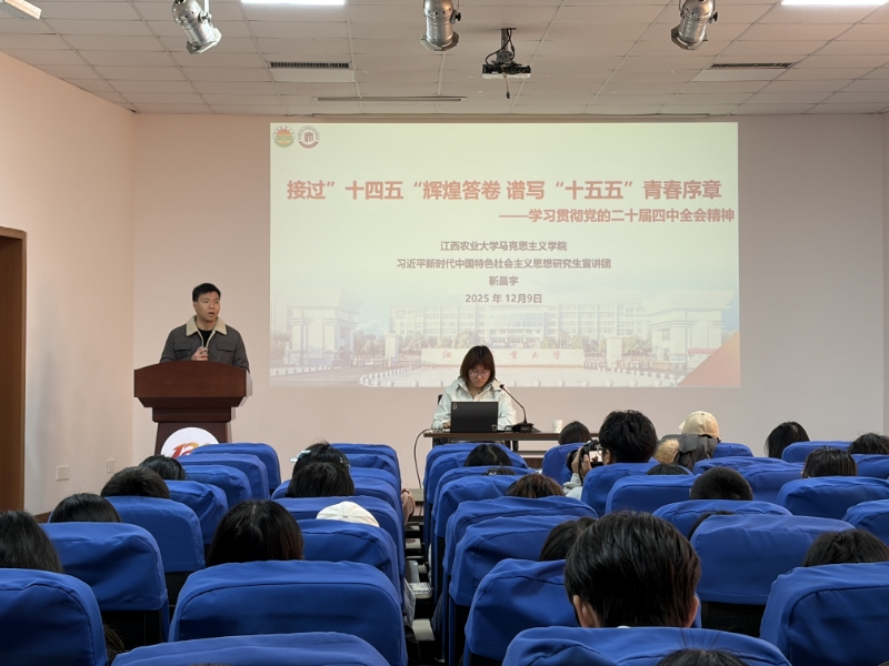 宣讲团成员靳晨宇以“回顾‘十四五’辉煌成就,谱写‘十五五’青春篇章”为题,从“十四五”国家壮阔发展成就、江农在红土地上的科技贡献、青年投身“十五五”建设的使命担当三个方面展开讲述。她结合鲜活案例与翔实数据,生动解读了“十五五”规划蓝图与中国式现代化的深刻内涵,激励青年学子将个人成长融入国家发展大局,在强国建设的实践中锤炼成才。