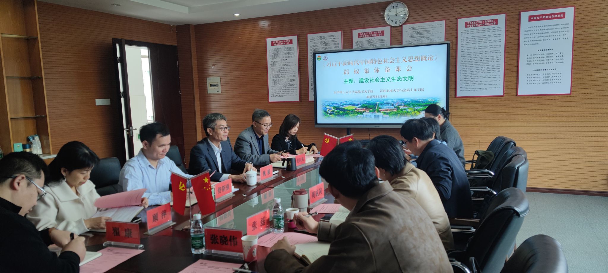 为深入学习贯彻党的二十届四中全会精神,切实提升“习近平新时代中国特色社会主义思想概论”课程教学质量,11月5日下午,学校马克思主义学院联合东华理工大学马克思主义学院举办“建设社会主义生态文明”专题跨校集体备课会。东华理工大学马克思主义学院院长华启和、副院长周成莉及专题骨干教师和学院院长魏毅及教研室、专题骨干教师参加。会议由学院副院长黄以胜主持。