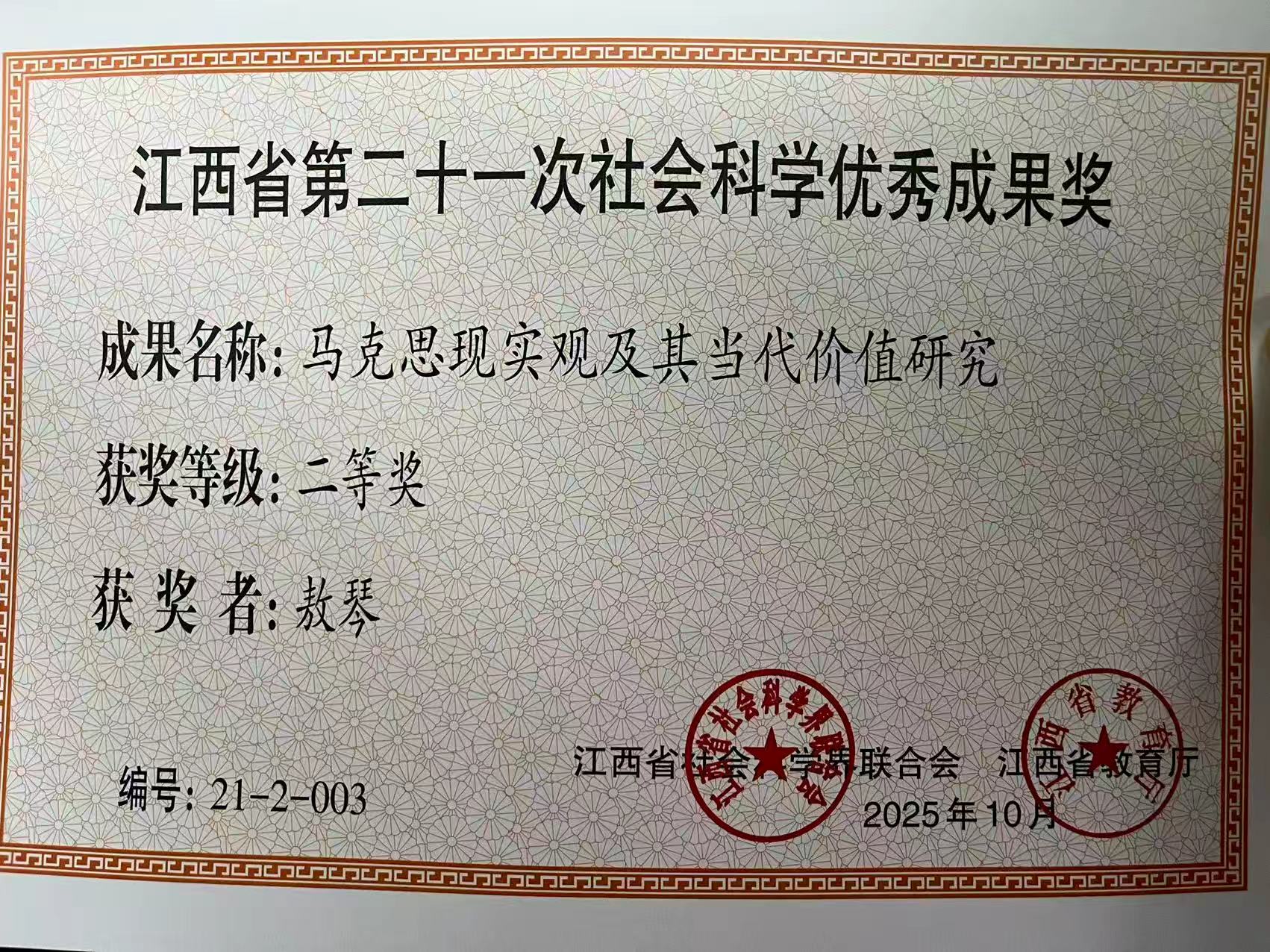 近日,江西省社会科学界联合会、江西省教育厅印发了《关于公布江西省第二十一次社会科学优秀成果奖获奖项目的通知》。学院副教授敖琴博士的专著《马克思主义现实观及其当代价值研究》(中国社会科学出版社出版)荣获优秀成果奖二等奖。
