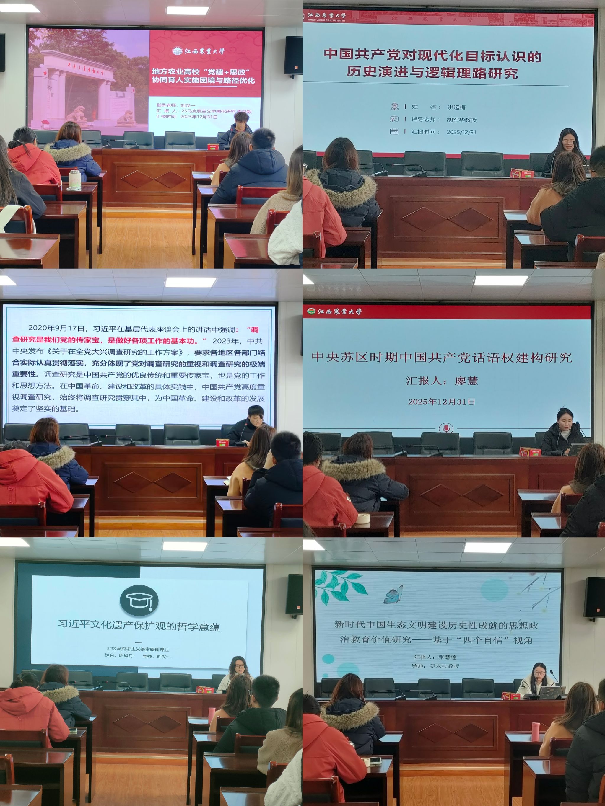 论坛中,六位研究生代表依次进行论文汇报,主题涵盖“党建+思政”、毛泽东调查研究思想、中国共产党对现代化目标认识、中国共产党话语权构建、习近平文化遗产保护观及生态文明建设等多个前沿方向。汇报人围绕选题背景、研究思路、框架设计及核心论点展开论述,展现出了扎实的学术积累与问题意识。